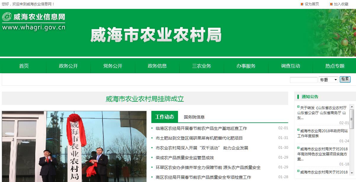 新起点,新征程,初心引航,兴农建功!2019年1月1日,威海市农业农村局挂牌成立,副市长高书良出席仪式并揭牌。根据市级机构改革的实施意见,整合市委农村工作领导小......