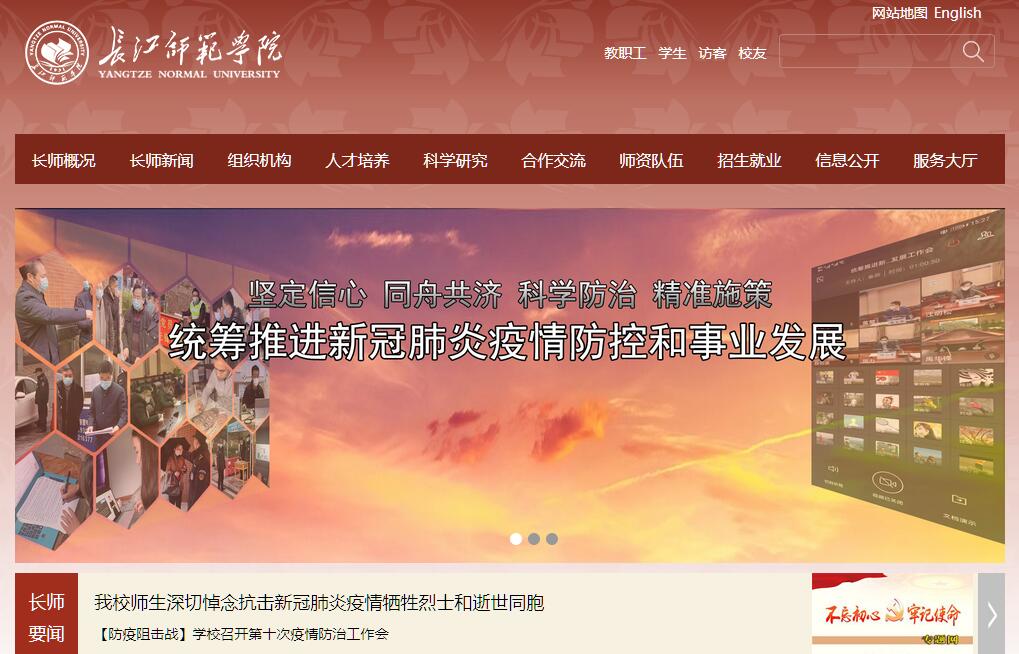 学校是一所重庆市属普通本科院校,2006年9月,由涪陵师范学院更名为长江师范学院,有80多年的办学历史,在社会各界享有良好办学声誉,在重庆市高校布局结构中具有重要地位,为地方经济建设和社会发展做出了突出贡献。在新形势下,学校一如既往地担当起服务地方经济建设与社会发展的责任与使命,积极进取,努力开创统筹城乡发展的地方高校建设新局面。学校所在地涪陵区,位于长江与乌江交汇处,素有“乌江门户”“千里乌江第一城”之称,地处重庆市发展新区核心增长极。涪陵是先秦时期的巴国国都,文化积淀深厚,多元而独特的巴枳文化、易理文化和榨菜文化,孕育出具有时代特征的“艰苦创业、不甘人后”的涪陵精神。涪陵有辉煌的书院办学史,北宋时期在长江北岸创办的北岩书院时称“理学圣地”,书院遗风及其理学精神厚泽涪陵的文化传承和教育发展。在地方文化的浸润孕育下,长江师范学院承袭“诚意正心、钩深致远”的治学旨趣,形成了“学高身正、敬业自强”的校训,确立了“创新为魂、应用为要、能力为本、服务为重”的办学理念。学校地理位置优越,交通便捷,四通八达,紧挨沪渝、渝怀、南涪等3条铁路和沪渝(南线)、重庆三环、渝涪等3条高速公路,学校距涪陵高铁车站3分钟车程,可直达北京、上海、广州、武汉、福州、成都等地,30分钟可到达重庆火车北站;距高速公路入口2分钟车程,40分钟可到达重庆主城。2001年以来,学校各项事业发展迅速,办学实力显著增强。2007年,学校接受教育部本科教学工作水平评估,取得了良好的成绩。学校现有李渡和江东两个校区,校园占地面积近1900亩,建筑面积70万平方米,校园环境优美,建筑特色鲜明,是读书学习的理想场所。教学科研仪器设备总值近2.1亿元。建有实验实训教学中心12个,市级实验教学示范中心4个,校外实践教学基地290个。图书馆总建筑面积3.5万平方米,馆藏纸质文献图书和报刊总量169.79万册,订购和自建中外文数据库33个,可提供读者使用数据库63个,数字资源容量达48TB。学校现有文学院、政治与历史学院(马克思主义学院)、管理学院、财经学院、外国语学院、数学与统计学院、计算机工程学院、教师教育学院、电子信息工程学院、化学化工学院、生命科学与技术学院、机械与电气工程学院、音乐学院、体育与健康科学学院、美术学院、土木建筑工程学院、传媒学院、大学外语教学科研部、国际学院、继续教育学院等20个二级教学单位。设有53个本科专业,涵盖文学、理学、教育学、法学、管理学、历史学、经济学、工学、农学、艺术学等十大学科门类,形成了以文学、理学为基础,教育学、经济学、管理学、工学学、艺术学等为主干,多学科相互融合、协调发展、优势互补的学科专业架构。中国语言文学是“十一五”重庆市重点学科,民族学、物理化学是“十二五”重庆市重点学科,教育学、民族学、化学、园艺学是“十三五”重庆市重点学科。学校现有国家级特色专业建设点1个,市级特色专业9个,市级特色学科专业群2个。有市级精品课程10门,市级精品视频公开课5门,市级精品资源共享课3门。学校是教育部初中校长国家级培训计划的培训院校、重庆市中小学骨干教师培训基地、重庆市三峡移民劳动技能培训基地、重庆市属高校唯一的少数民族预科教育基地。学校现有专任教师1042人,其中正高职称121人,副高职称283人,高级职称比例38.77%;博士学位教师305人,占专任教师的29.27%,硕士学位教师540人,硕士学位以上教师占专任教师的81%。有兼职博士研究生导师7人、硕士研究生导师55人。有重庆市哲学社会科学领军人才、重庆市学术技术带头人、重庆市“巴渝学者”特聘教授、重庆市教学名师等44人。有“双聘院士”2人,“巴渝海外引智计划”国际知名专家2人。有全国优秀教师1人,全国高校优秀思想政治理论课教师1人,国家语言文字工作先进个人1人,高校思想政治理论课教师年度影响力提名人物1人,重庆市优秀教师1人,重庆市教育系统优秀教育工作者1人。重庆市先进工作者1人,重庆市教育系统职业道德标兵1人,重庆市高校青年骨干教师11人,重庆市终身教育奖1人,重庆市师德先进个人2人,重庆市中青年骨干资助计划28人。学校现有各级各类科研创新平台54个、创新团队16个,其中有国家部委联合共建研究基地3个,重庆市人文社会科学重点研究基地2个,重庆市工程研究中心3个,重庆市协同创新中心2个,重庆市高校重点实验室2个,重庆市博士后科研工作站2个,国际合作研究基地和部市共建研究基地6个,省部级以上科研创新团队7个。主办有《长江师范学院学报》《三峡环境监测》《长江师范学院报》三种全国公开发行报刊和《三峡教育论坛》《乌江论丛》《巴渝教育探索》等重庆市内部连续出版刊物。近三年来,学校教师共承担国家自然科学基金、社科基金等国家级项目63项,国家部委和重庆市科研项目354项,横向科研课题200余项。学校科研质量(FWCI)和高被引论文稳步提升,发表SCI论文577篇、EI(JA)论文208篇、CSSCI论文392篇,职务发明专利申请390件,授权164件,新品种认定及科技成果转化20余项。学校获得教育部高等学校科学研究优秀成果奖、中国民间文艺山花奖、重庆市社会科学优秀成果奖、重庆市科学技术奖等省部级以上科研成果奖50项。学校面向全国27个省(市、自治区)招生,现有